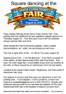 The Santa Clara County Fair has typically been held at the beginning of August, although the size and format has varied from year to year. Some years, local square dance clubs have participated in "Dancing at the Fair" by dancing there on their regular club night. Some years all the dancing has been on one night.