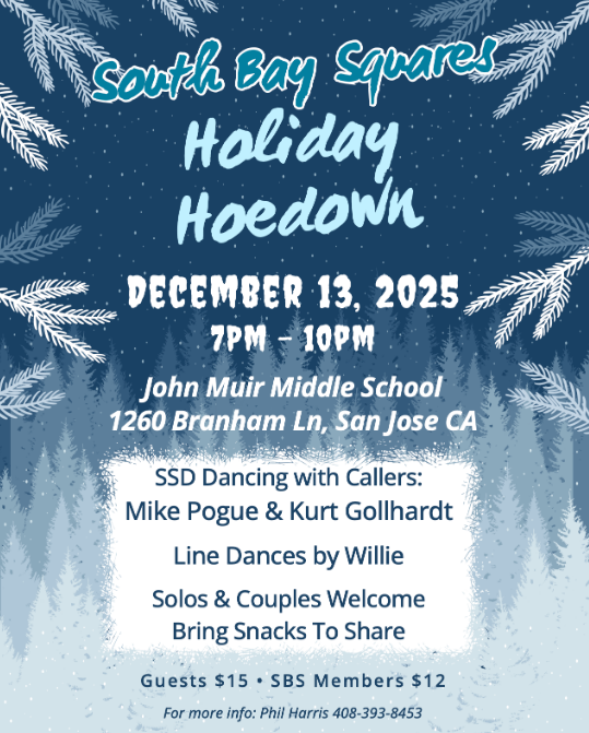 South Bay Squares Holiday Hoedown 7:00-10:00pm SSD with lines John Muir Middle School, 1260 Branham Lane, San Jose Callers: Mike Pogue, Kurt Gollhardt Info: Phil Harris 408-393-8453 https://www.scvsda.org/sbs-20251213.png |